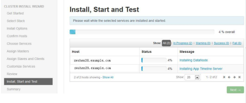 4. Ambari Server 会自动安装 Ambari Agent 到刚才指定的机器列表。安装完成后,Agent 会向 Ambari Server 注册。成功注册后,就可以继续 Next 到下一步