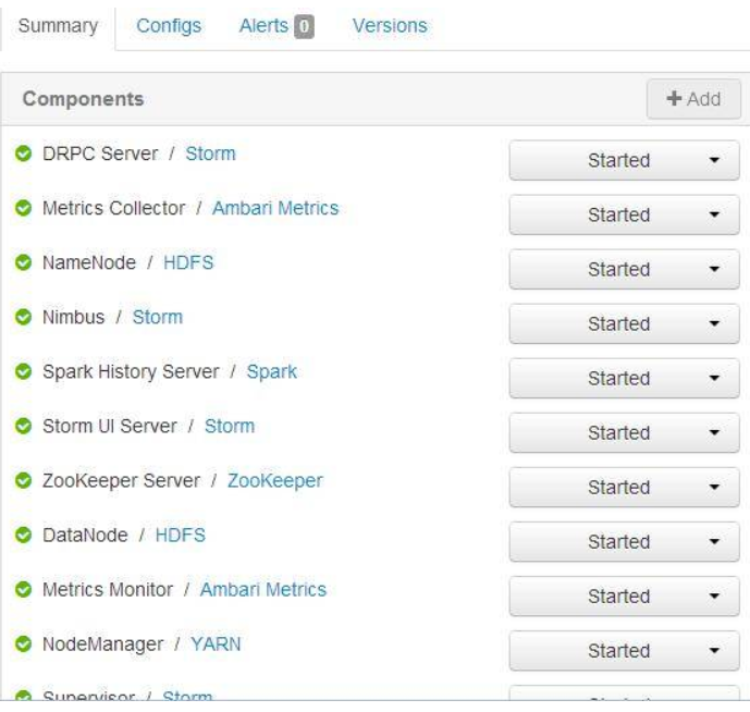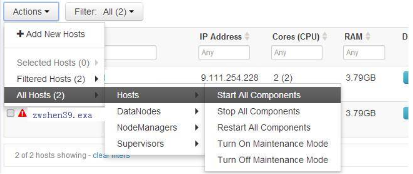 All Hosts -> Hosts -> Start All Components,Ambari 就会将所有 Service 的所有模块启动