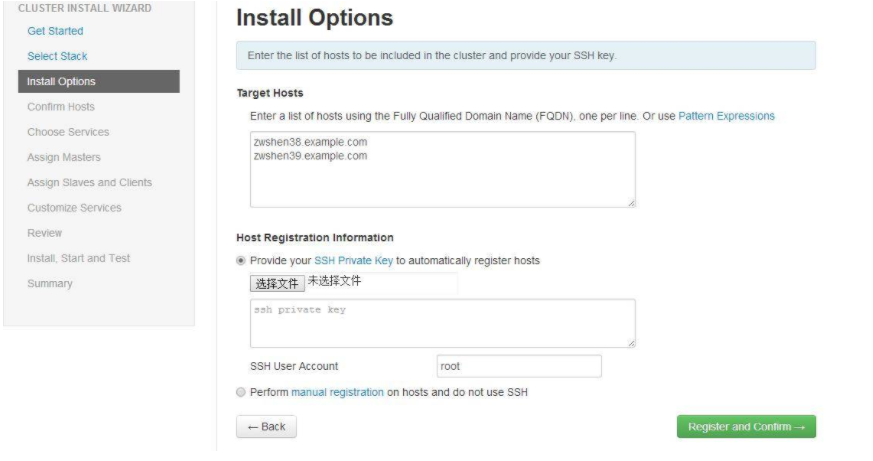 manual registration) on hosts and do not use SSH”。因为我们需要 Ambari Server 自动去安装 Ambari Agent