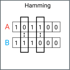 汉明距离是两个向量之间不同值的个数。它通常用于比较两个相同长度的二进制字符串。它还可以用于字符串,通过计算不同字符的数量来比较它们之间的相似程度。