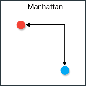 曼哈顿距离,通常称为出租车距离或城市街区距离,计算实值向量之间的距离。想象描述均匀网格(如棋盘)上物体的向量。曼哈顿距离是指两个矢量之间的距离,如果它们只能移动直角。在计算距离时不涉及对角线移动。