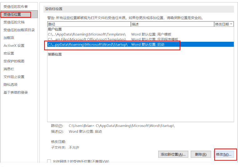 第四步,打开word_文件_选项_信任中心_信任中心设置_受信任位置_启动_修改_复制这个位置的地址_退出word。在文件里按照刚才的地址打开文件夹。
