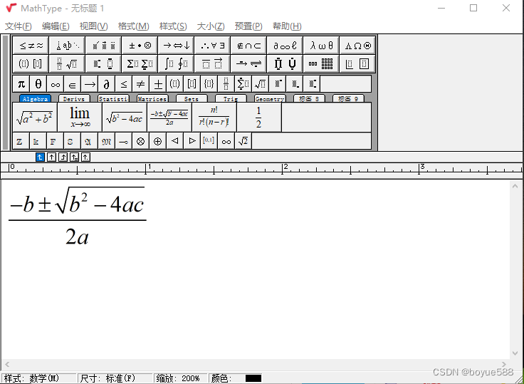 所见即所得:添加一个公式时,点击MathType界面中的模板,模板设计样式将直接结果显示在MathType编辑框中。对此问题模板可以进行选择适当的修改,以完成计算公式的编辑工作任务。