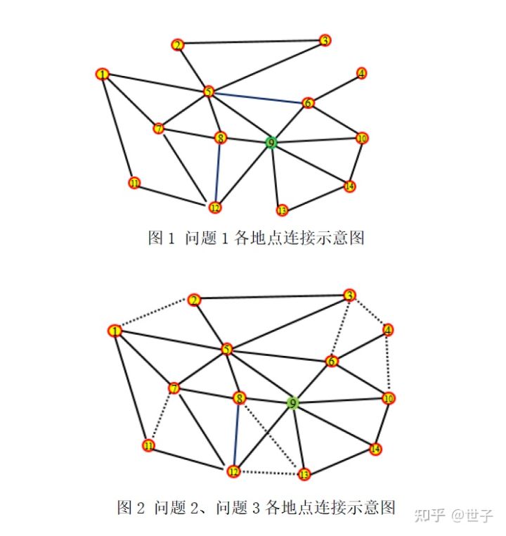 1.图 1 给出 14 个地点, 其中 实线代表各地点之间的路线情况。 若目前所有应急物资集中在第 9 个地点,配送车辆的 最大 载重量为 1000 千克 ,采取配送车辆(无人机不参与)的配送模式 。请结合附件 1 建立 完成一次 整体 配送 的数学模型 并 给出最优方案。