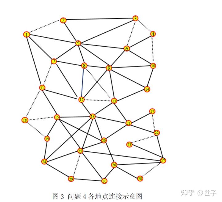 对于该问题,我们可以用地毯式搜索的思想量化约束条件建立模型,不用担心这种方法有点笨会减分,这只是建立模型,求解模型是Lingo做的,人家是可不是用最笨的算法搜索最优解的,只是利用这种最笨的思路完善的纳入所有条件,在全部可能范围内求解,保证结果一定是正确的。首先可以将无人机的可飞行时间量化为最大远离汽车的距离,对于问题二,由于车辆上能承载所有地点的物资需求量,因此,让无人机能将自身的物质全部发出去,汽车再去接它即可(或等它)。这样其实只需要在第一问要建立的优化模型中,对无人机可到达地方进行标识(与汽车到过的位置标识一样),但是优化原理还是一样的,只不过因为无人机的加入,能使地点能提前到达而已。