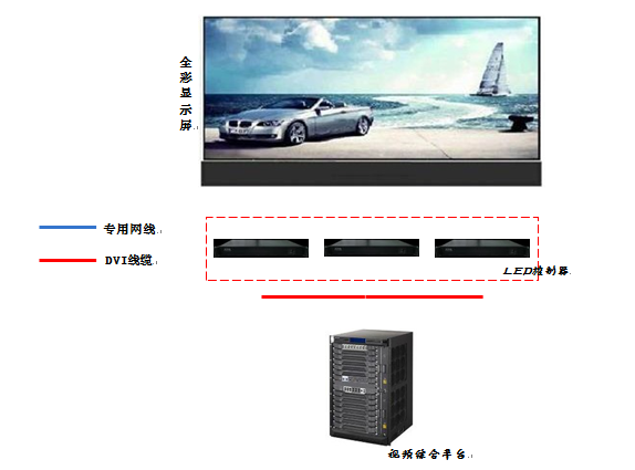 LED 控制器作为全彩显示屏的控制系统,接收视频综合平台输出的 DVI 信号,通过专用网络线缆驱动 LED 显示屏显示,实现多种视频信号的高清输出显示。一个 LED 控制器的最大带载分辨率 1920×1080,整个系统所需的 LED 控制器的个数由 LED 全彩显示屏的分辨率决定。