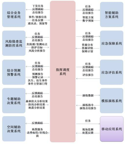 指挥调度系统从综合应用系统其他子系统(包括综合业务管理系统、综合预测预警系统)及移动应用等系统获取突发事件的相关信息,从智能辅助方案系统、应急保障系统获取多种应对方案以及资源调配方案,构成指挥调度系统的输入信息;通过情况综合、任务分析等处理,生成命令和发布信息等输出,输出内容主要包括事件要情、预警信息、资源调配、部门责任和职责、注意事项、领导指示、实施措施等,指令性信息通过应急平台采取多种方式下达,发布性信息通过媒体和网站向公众发布;通过综合业务管理系统获取反馈信息,实现对下达的命令进行跟踪,掌握命令执行情况。指挥调度系统与其他业务系统的关系如下图所示: