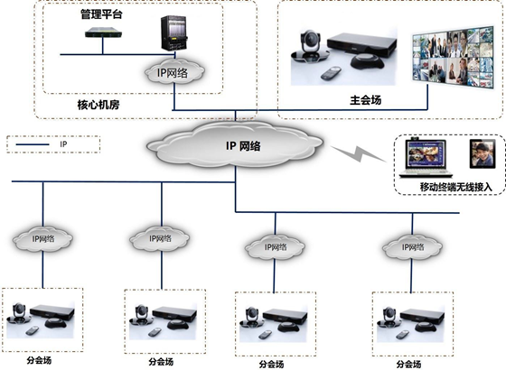 整个系统依托于 IP 网络建设,建议每个终端占有不低于2M 的带宽,以便视频会议达到 1080P 的图像效果。