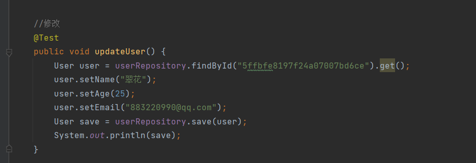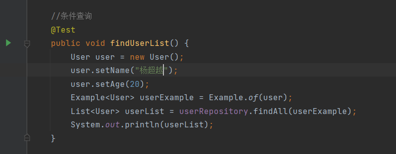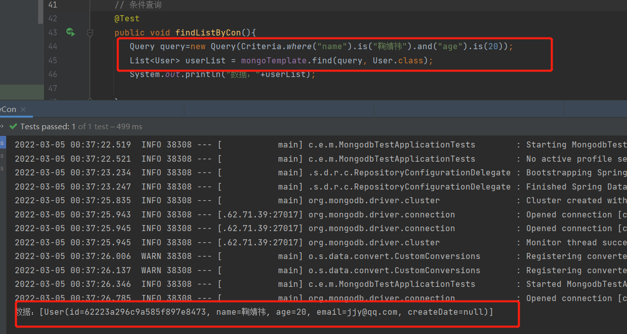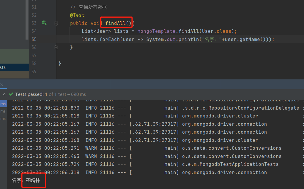 注意:上面不管是通过mongoTemplate还是mongoRepository来进行crud其实都是用的内部封装好的方法,除了他们提供好的方法我们也可以进行自定义方法,比如我用mongoRepository来查询name="xxx"也可以这样定义方法: