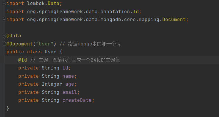 我们在使用mysql的时候有表对应的实体,那么mongo也一样,需要建立自己使用的实体类,我新建一个User类作为实体类: