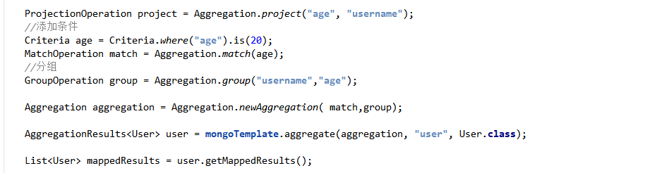 - 实例:ProjectionOperation project = Aggregation.project("age", "username");