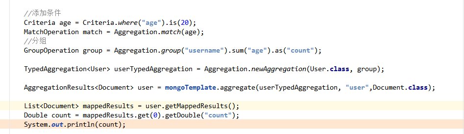 - 注释:将Aggregation各个条件进行组合.交由mongoTemplate进行处理.