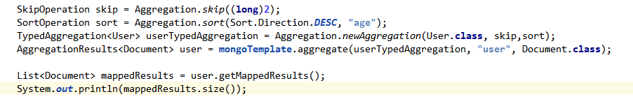- 实例:TypedAggregation<User> userTypedAggregation = Aggregation.newAggregation(User.class, skip,sort);