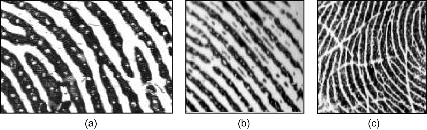 由于指纹图像是条纹图案(暗带和亮带),因此使用全局或局部阈值技术(Gonzales & Woods,2007)不允许将指纹区域与背景有效隔离。事实上,真正区分前景和背景的不是平均图像强度,而是前景中是否存在条纹和定向图案,以及背景中是否存在各向同性图案(即没有主导方向)。如果图像背景始终均匀且比指纹区域亮,则基于局部强度阈值的简单方法可以有效地区分前景和背景。在实践中,存在噪声(例如手指表面或实时扫描指纹扫描仪表面的灰尘和油脂产生的噪声)需要更强大的分割技术。