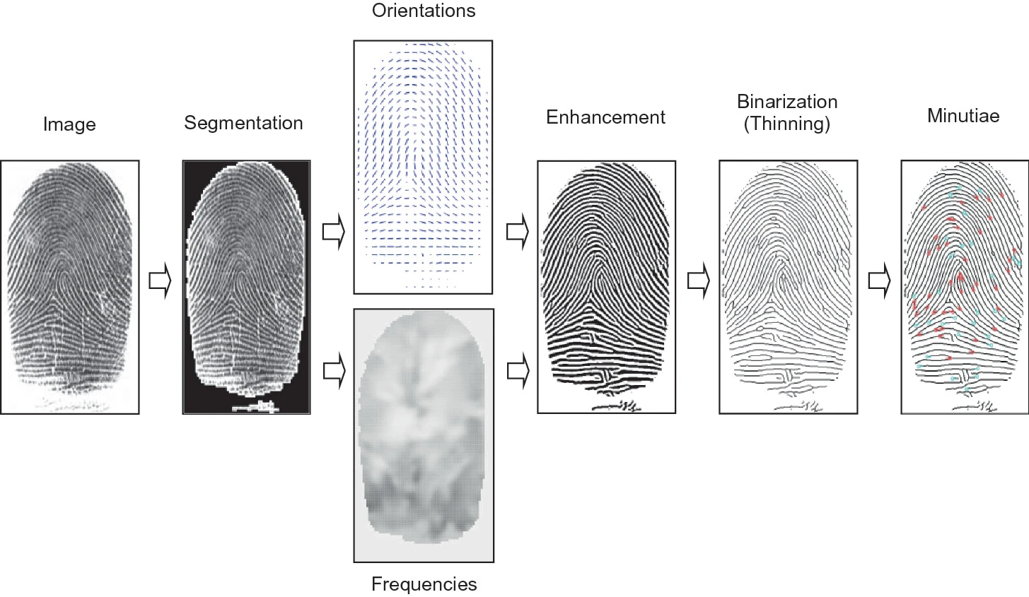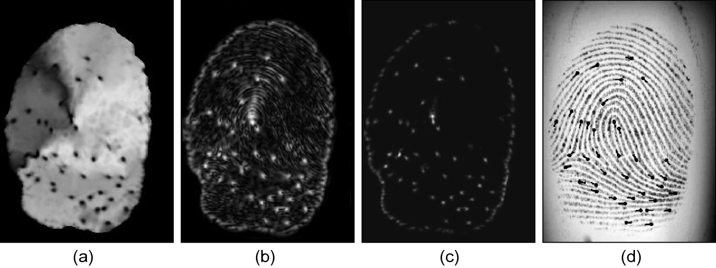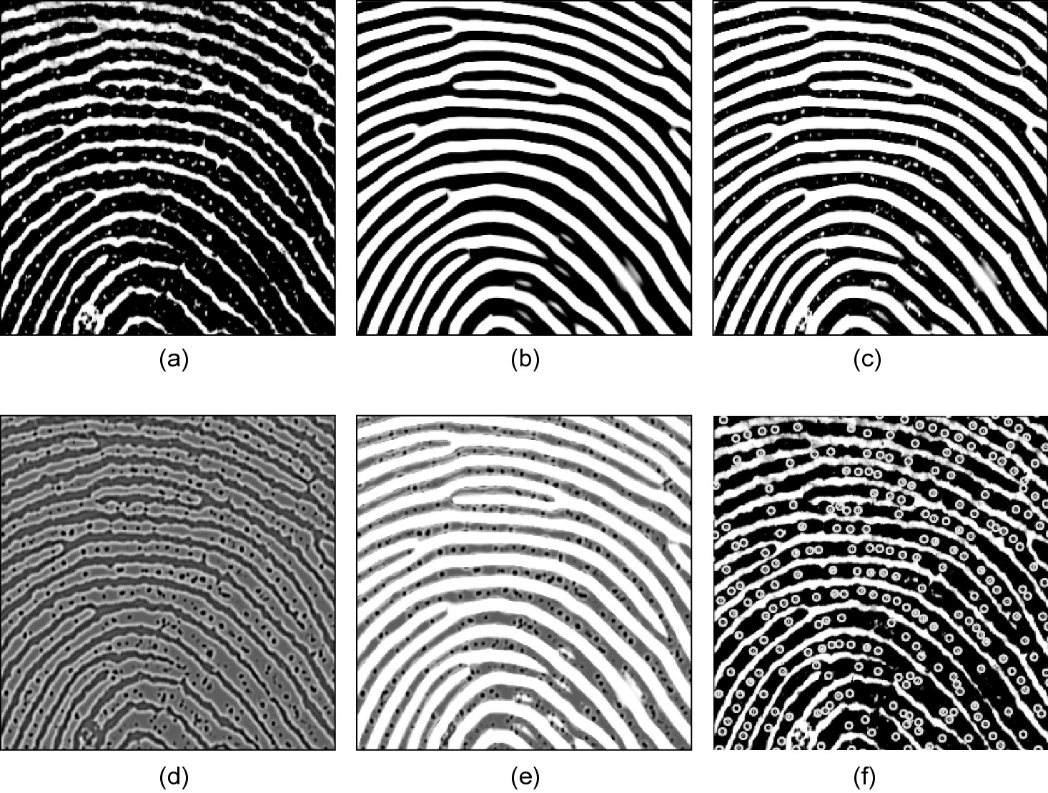 上述特征都是具有解剖学意义的指纹特征(例如,脊线、奇异点、细节点、汗孔)。从指纹图像还可以提取没有明确解剖学意义的特征,SIFT关键点、深度网络特征。这些特征也能用于指纹匹配,详细介绍见指纹匹配综述。本文主要讨论具有明确解剖学意义的三级特征的提取。下图显示了提取细节点的典型处理步骤。指纹特征提取通常按照一、二、三级的顺序进行,因为下一级特征的提取需要上一级特征的指导,才能抵御噪声干扰。下面的章节就按照这样的顺序组织。