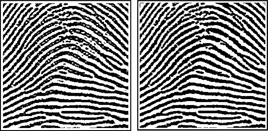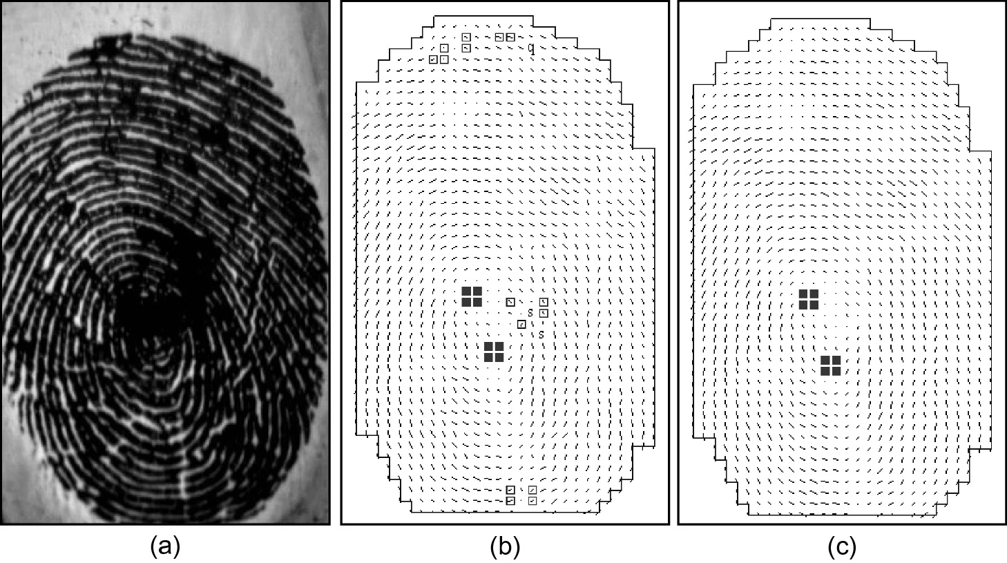 从低质量指纹计算得出的方向场可能包含许多错误。许多时候,局部平滑是非常有效的(见下图)。