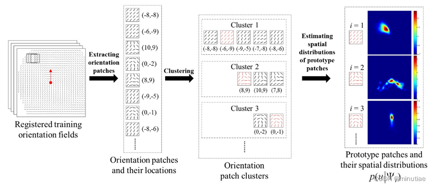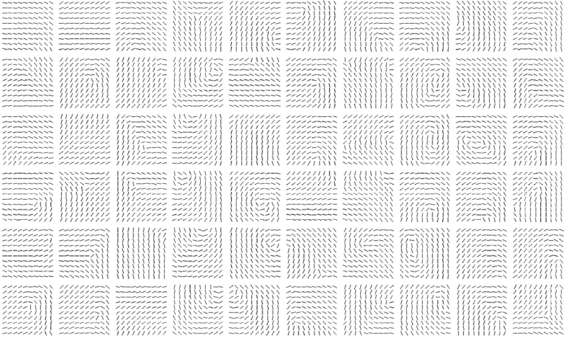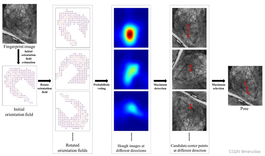估计局部脊线方向(其整体称为方向场)是指纹特征提取中最重要的步骤之一,它对于许多后续任务的影响很大,包括脊线频率估计、脊线增强、指纹匹配等。