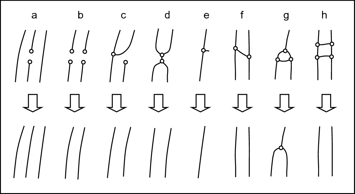 第二级特征记录具体脊线的位置,重点是它结束和分叉的地方,但是并不关注脊线的内外轮廓等细节(脊线不是数学中的线)。脊线突然结束和分叉的地方,称为细节点(minutia)。细节点是人工和自动指纹比对最常用的特征。Galton(1892)最早定义了指纹细节点并观察到它们终生不变。在比较完整的指纹中(如滚动滚动),细节点的数量可以超过100个。实际中,仅需少量(例如,12-15个)匹配细节点就足以推断两个指纹来自同一根手指。按照Champod等人(2016)的估计,奇异区内和奇异区外的细节点平均密度分别为每平方毫米0.49和0.18个。虽然专家在人工比对中可能利用多种类型的细节点(几种常见类型如下图所示),但是指纹识别算法通常只考虑两种基本类型,因为其他复合细节点类型可以表示为结束点和分叉点的组合,而且自动识别不同细节点类型会引入错误。主要的指纹数据标准(ISO/IEC 19794-2,2011;ANSI/NIST-ITL 1-2011,2015)也仅考虑结束点和分叉点。由于细节点的属性至少包括位置和角度,实际上指纹的细节点集合包含了大量的一级特征。按照Feng和Jain(2011)的重建算法,仅用细节点的位置和角度,就可以近似重建出脊线图。因此细节点可以看作是脊线图的非常紧致的表示。