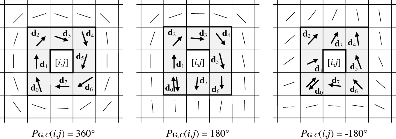 Kass和Witkin(1987)为上述问题提出了一个简单而优雅的解决方案,它允许对局部梯度估计进行平均。他们的基本思想是将角度加倍,以便每个方向估计都由矢量编码: