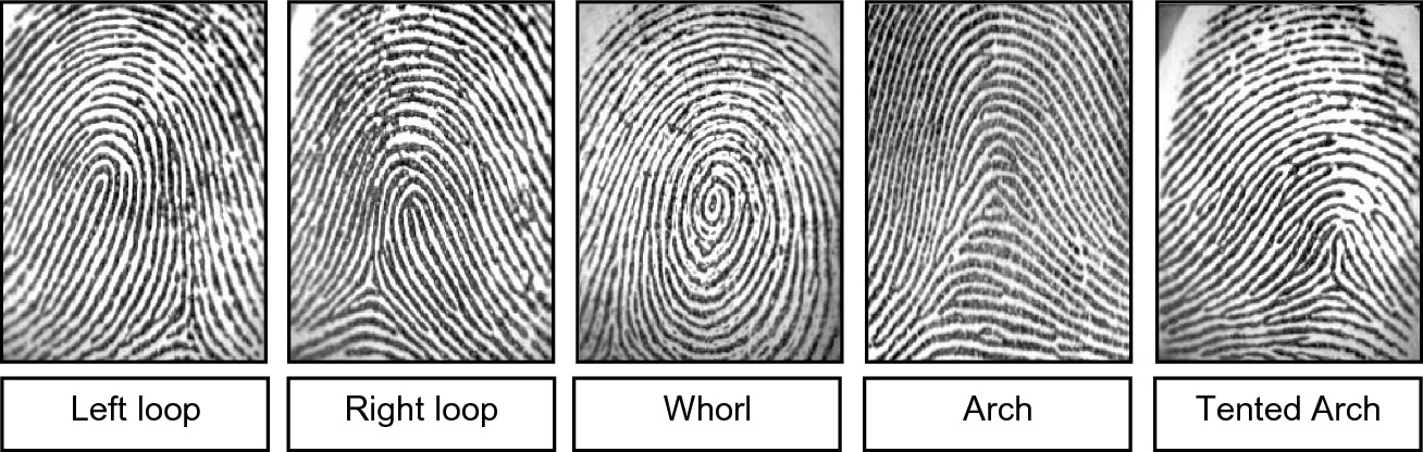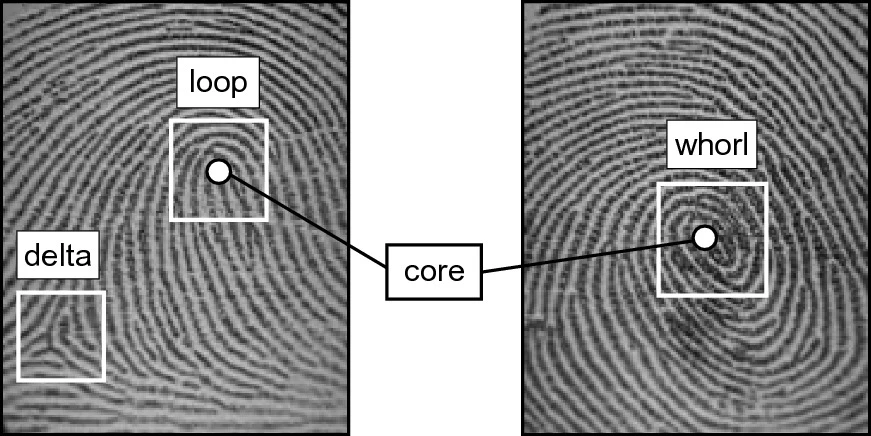 根据奇异点的分布和数量可以将指纹分为不同纹型(见下图),可用于人工和自动指纹检索。奇异点通常位于手指中央,由于这个区域能够确定指纹纹型,这个区域也称为模式区(pattern area)。奇异点还可以用来定义指纹的坐标系,将不同指纹对齐,方便指纹匹配、指纹大库检索、以及指纹模板保护。