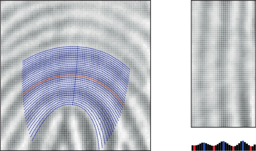 Sherlock(2004)建议沿多个离散方向投影局部窗口内的脊线;表现出最小变化的投影对应于脊线的方向。在Ji和Yi(2008)方法中,在计算投影之前,除中心线外的所有脊线都从局部窗口中移除。