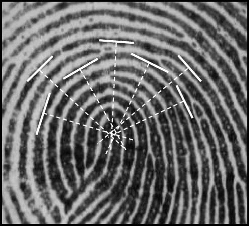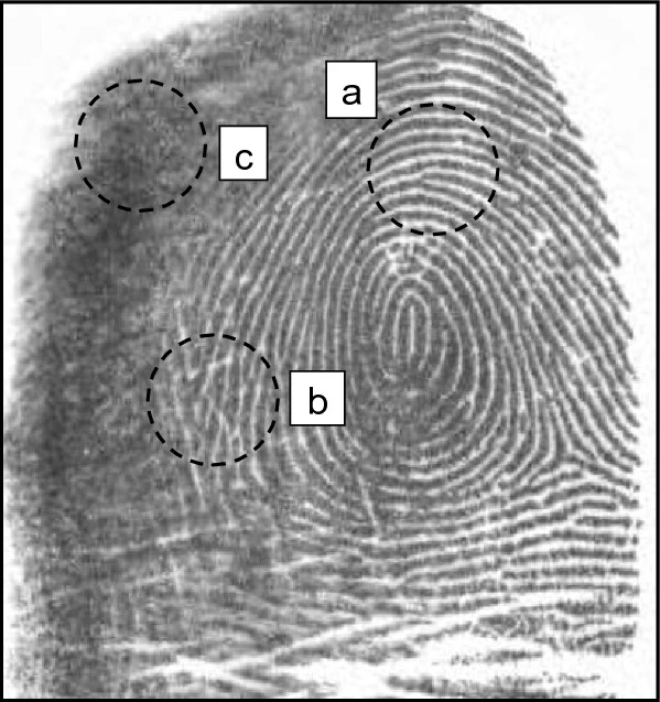 指纹的特征可以分为从粗到细的三个级别。第一级:脊线方向场和频率图(奇异点是方向场的特殊点);第二级:脊线骨架图(细节点是脊线的特殊点);第三级:脊线的内外轮廓(汗孔即内轮廓)。这些特征都是围绕脊线定义的,是有解剖学意义的。