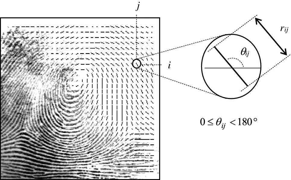像素 [ x , y ] [x, y] [x,y]处的局部脊线方向是脊线穿过以 [ x , y ] [x, y] [x,y]为中心的任意小邻域与水平轴形成的角度 θ x y θ_{xy} θxy,其范围是 [ 0 , 180 ° ] [0,180°] [0,180°]。由于方向场变化平缓,通常并不需要计算像素级的方向场,而只需要计算图像块级别的方向场,比如 8 × 8 8 times 8 8×8大小的图像块。指纹方向场的概念最早见Grasselli(1969)。方向场的元素 θ i j θ_{ij} θij代表图像块 [ i , j ] [i, j] [i,j]中脊线的平均方向(见下图)。还可以附带定义方向可信度 r i j r_{ij} rij,以表示方向的可信度(或一致性)。在低质量区域, r i j r_{ij} rij值较低;而在高质量脊线区域, r i j r_{ij} rij较高。