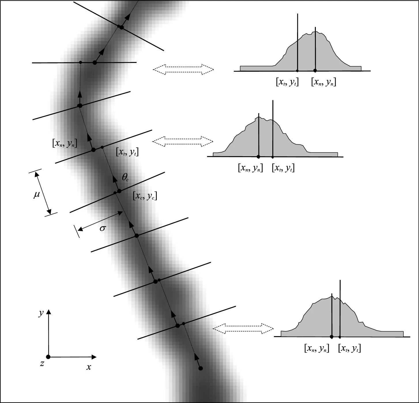 一种合理的假设是,沿着脊线方向灰度的总波动最小,而在正交方向上波动最大。Mehtre等人(1987)、He等人(2003)、以及 Oliveira和Leite (2008)的方法均是利用这样的假设。特别是,Oliveira和Leite(2008)计算了对应于每个长条的像素灰度的标准偏差,并根据长条与其正交长条之间的最大标准差对比度选择最佳长条(见下图)。