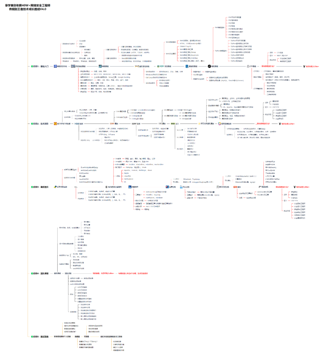 对于从来没有接触过网络安全的同学,我们帮你准备了详细的学习成长路线图。可以说是最科学最系统的学习路线,大家跟着这个大的方向学习准没问题。