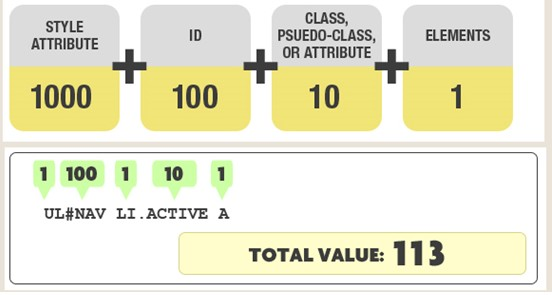 注意:通用选择器(*),子选择器(>),和相邻同胞选择器(+)并不在这个等级中,所以他们的权值为0