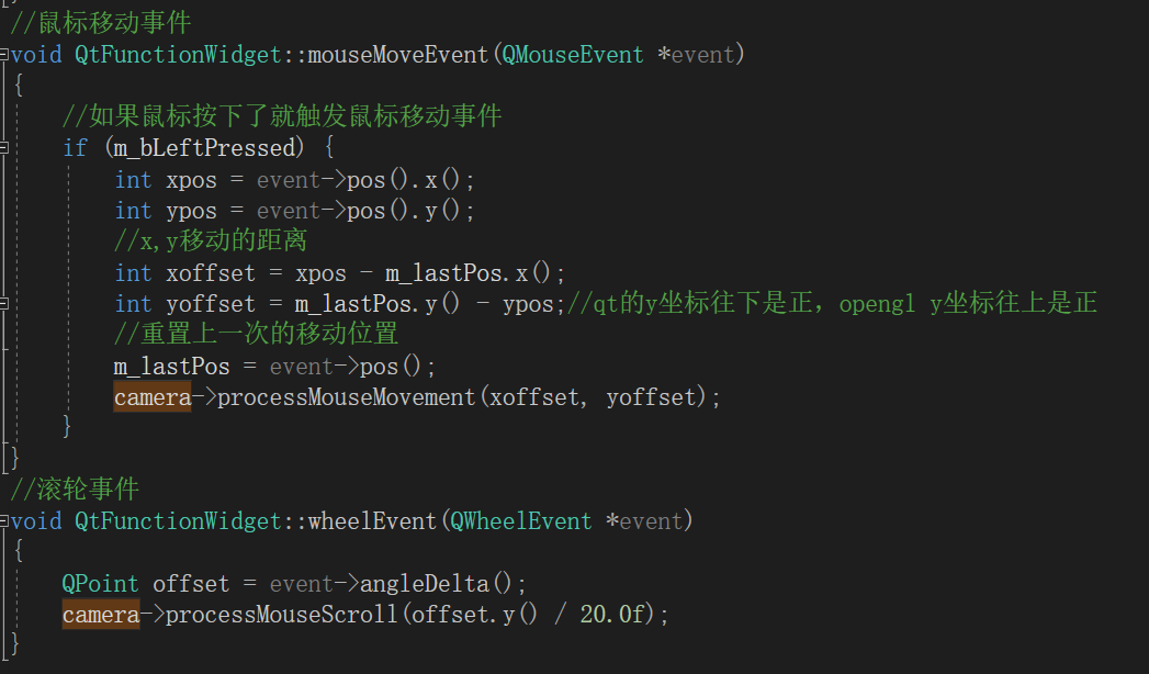 int yoffset = m_lastPos.y() - ypos;//qt的y坐标往下是正,opengl y坐标往上是正,openGL远点在中间,QT在左上角