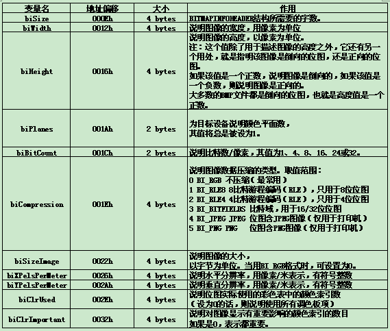 | biSize | 说明BITMAPINFOHEADER结构所需要的字数。 |