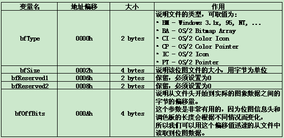 | 图像文件头 | 0000h | 文件标识 | 2 byte | 两字节的内容用来识别位图的类型: ‘BM’ : Windows 3.1x, 95, NT, … ‘BA’ :OS/2 Bitmap Array ‘CI’ :OS/2 Color Icon ‘CP’ :OS/2 Color Pointer ‘IC’ : OS/2 Icon ‘PT’ :OS/2 Pointer 注:因为OS/2系统并没有被普及开,所以在编程时,你只需判断第一个标识“BM”就行。 |