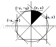 根据对称性原理,我们只需要计算黑色区域的点集合即可。同时,由于黑色区域的圆的切线斜率明显在-1到0,这点就可以和前面一节线段的计算方法相结合了。