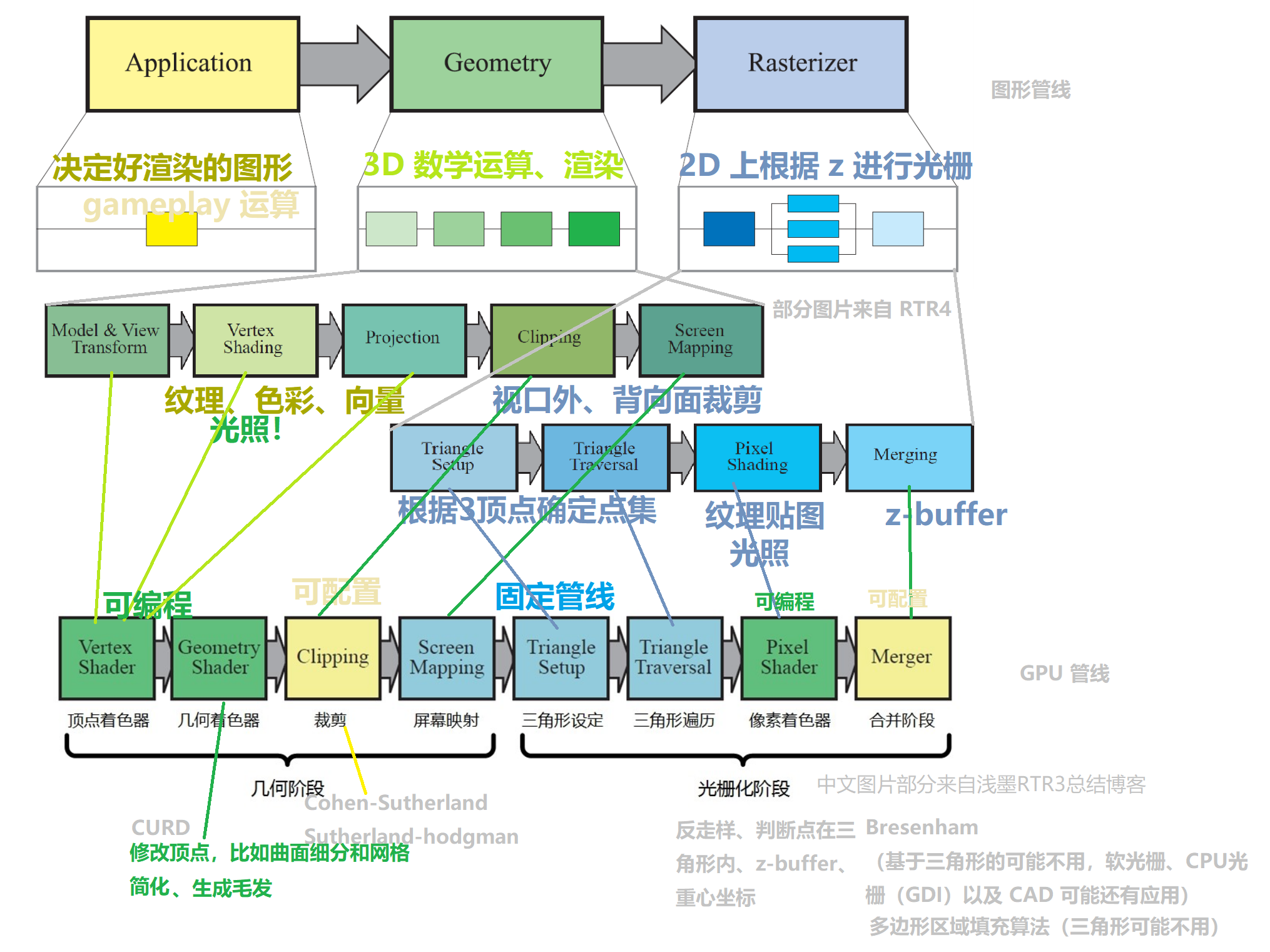 跟 LearnOpenGl 也逐渐走到写 shader 渲染渐变三角形、四边形的地步了,现在总结一下整个图形管线的流程,可编程管线中各个 shader 的工作和用途。以及 shader 的本身的用途。