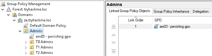 可以部署许多不同的钩子。您可以使用 GPO 来了解其他钩子。由于我们已经在利用 AD 房间中使用了第一个钩子,即受限组成员身份。现在让我们专注于第二个钩子。虽然可以访问所有主机很好,但通过确保我们在管理员积极处理它们时可以访问它们,它可以更好。为此,我们将创建一个链接到管理员 OU 的 GPO,这将允许我们在每次其中一个主机向主机进行身份验证时在主机上获取 shell。