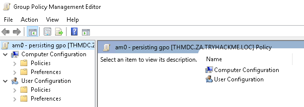 通过执行这些步骤,我们可以确保即使使用最高级别的权限,蓝色团队也无法删除我们的 GPO,除非他们模拟域控制器的计算机帐户。这使得首先发现变得更加困难,即使他们发现了 GPO,也很难删除。我们甚至没有所需的权限来与我们的策略交互,因此在执行网络重置之前,必须留在那里。您可以通过将 RDP 应用到其中一个 THM 服务器来验证 GPO 是否仍应用。