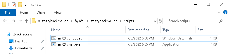 $thm scp am0_script.bat za\Administrator@thmdc.za.tryhackme.loc:C:/Windows/SYSVOL/sysvol/za.tryhackme.loc/scripts/