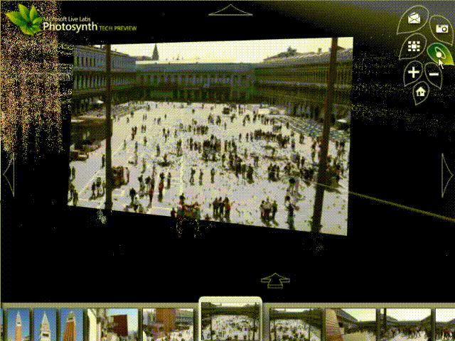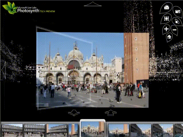 PhotoSynth的一大特色,是可以允许人们用上帝视角来观察某个特定的景点,并且可以任意切换视角。用户看到的图像实际上可以是从成百上千互联网上获取的图像中渲染而成的,比如下面这样: