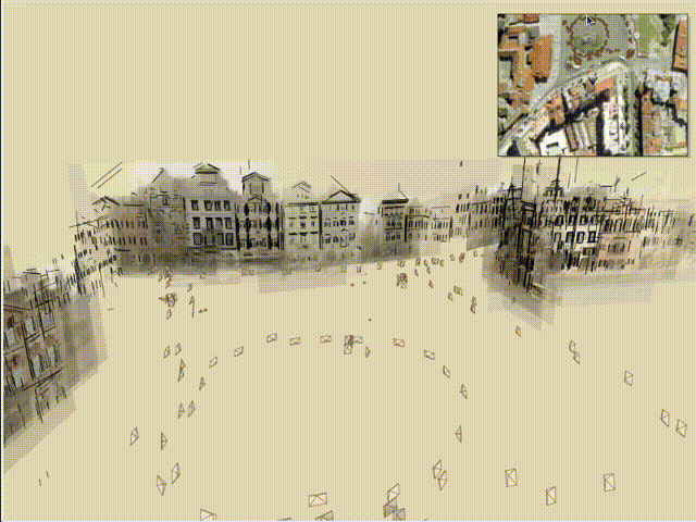 在Photo Tourism的主界面上,显示了点云对应的大量相机,通过点击相机,它会引导用户浏览到对应的图像细节。