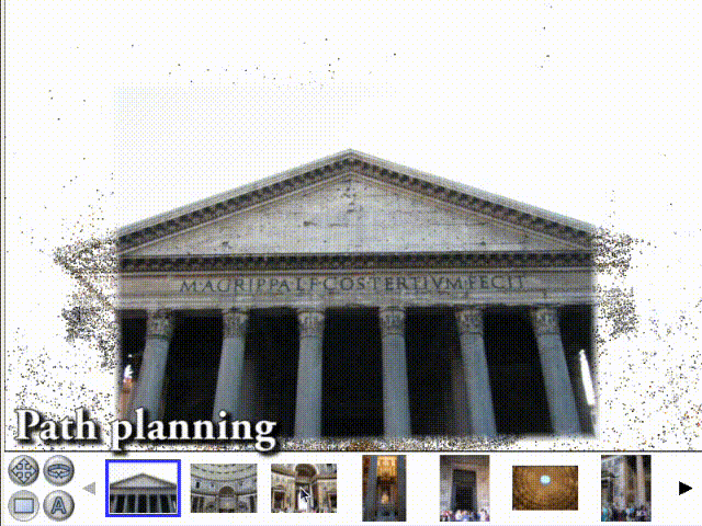 有了更好的平台的支持,Noah在Photo Tourism的基础上进行了更深入的研究。在2008年的SIGGRAPH,他展示了论文Finding Paths through the World's Photos和相关成果,他能够通过对图像数据的空间信息的分析,自动挖掘出大量图像拍摄时遵循的轨迹信息,从而能够做到让计算机像导游一样带领用户以最佳的路径浏览某个目标区域,见下面的动图: