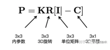 可以看到,一个三维空间中的点X,会被一个投影矩阵P投影为二维图像上的点x。这里的矩阵P由几个部分组成: