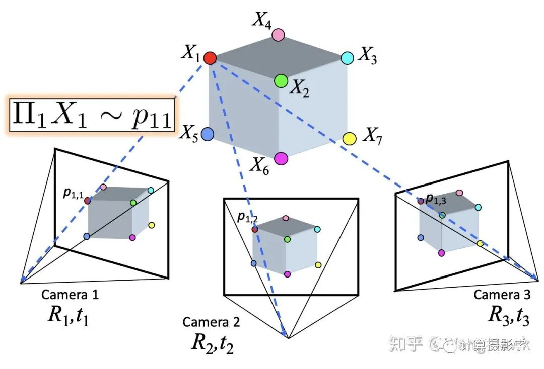 在下面这个示意图中,我们有三幅已知图像,展示了同一个立方体,它的几个角点是实现确认并已经一一对齐好了的。现在我们首先估计出这个立方体的角点的三维坐标Xi,估计出三个图像对应的相机参数(用投影矩阵P