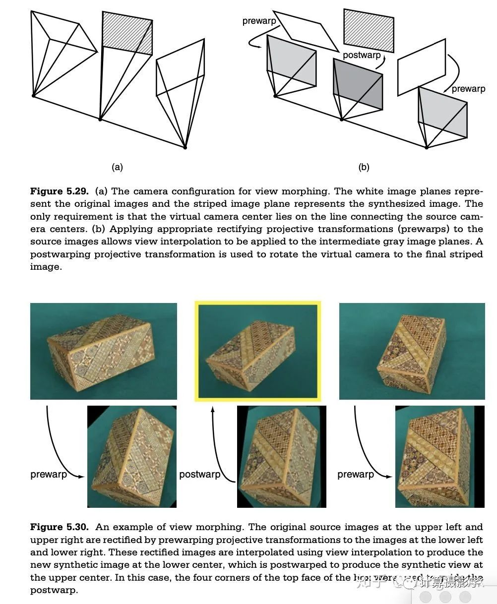 这时候View Synthesis这种技术就很有用了,事实上View Synthesis是基于图像的渲染领域的主要问题之一,它的目的是利用已知的图像创建虚拟视角的逼真的新图像。有很多方法来做虚拟视角图像的生成,Richard在书中提到的方法原理如下,你可以看到这是通过先把图像利用三维旋转信息校正到同一平面进行融合,然后再反变换回原始空间来完成的。