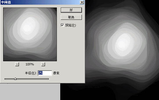 6、合成相近的颜色:对图像应用“滤镜->杂色->中间值”命令,制作按地形的高度排列等高线的阶梯形状。