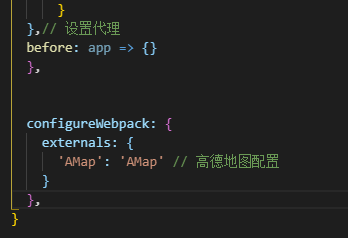 2、vue.config.js中添加一个配置,configureWebpack这里可以增加jquery的,也可以添加我们地图配置的,我这里遇到的坑是,没注意到层级,导致这个配置放在了devServer: { 这里面,粗心的错误