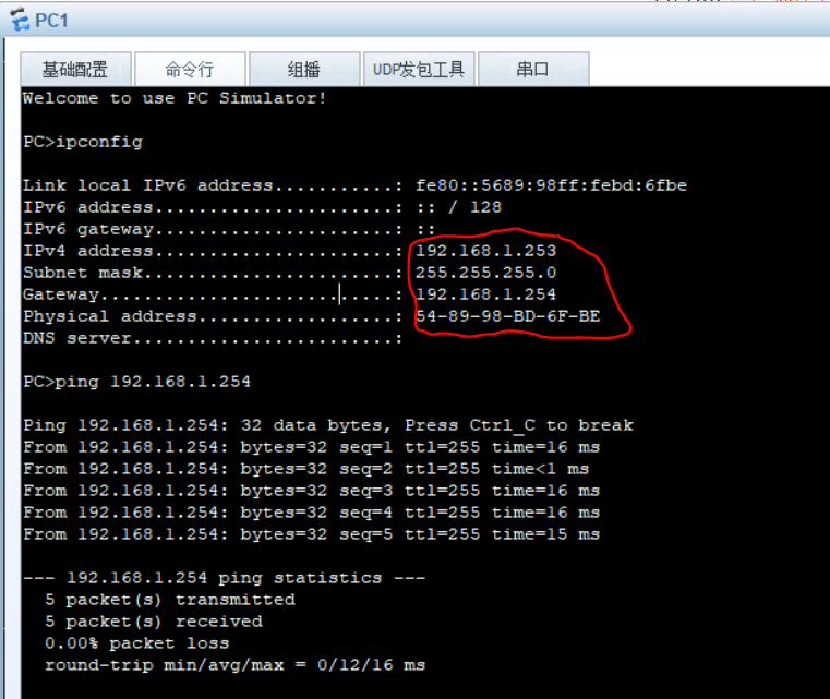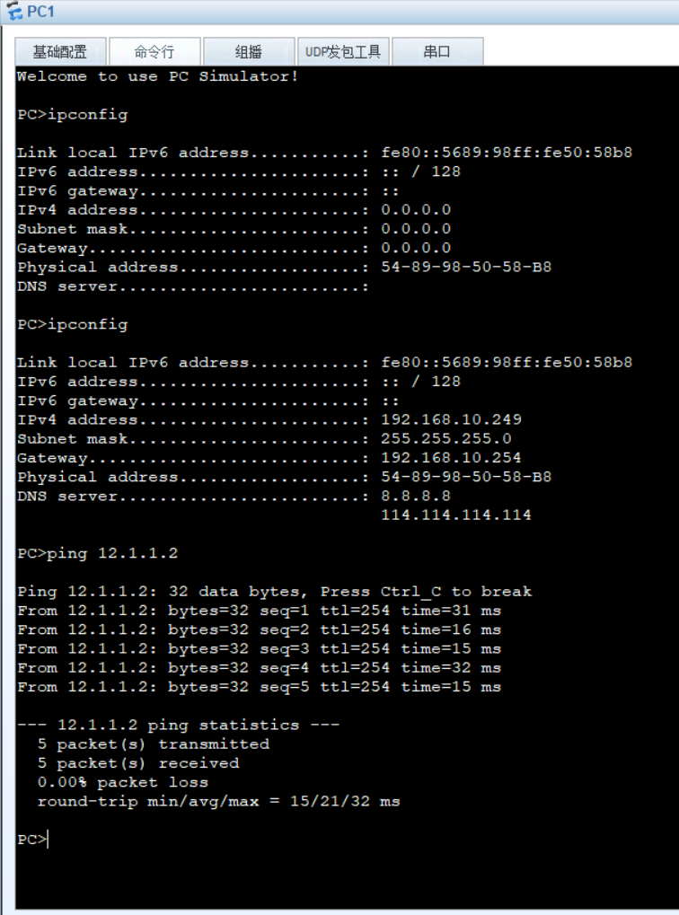 去PC端基础配置里面把地址改成DHCP,查看IP如下:
