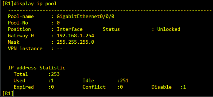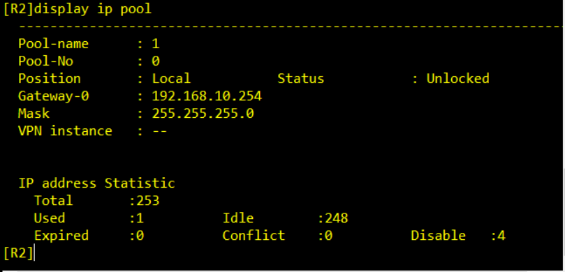 R2-ip-pool-1]excluded-ip-address 192.168.10.250 192.168.10.253(排除地址250到253四个地址)