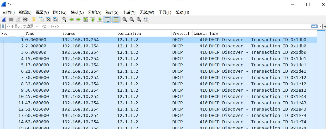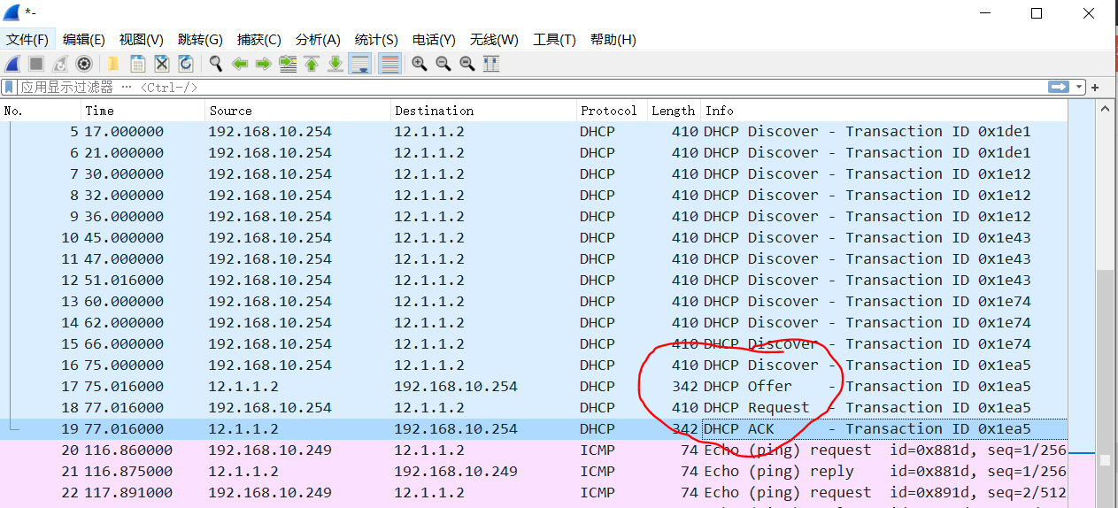 由图可见PC端向R2一直再发送DHCP discover包,没有收到回应包。