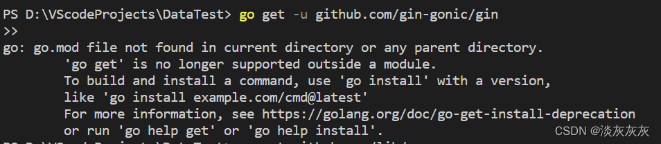 然后又想到是不是又是只有这个项目文件有效,于是去cmd命令行试了试这个安装指令,又告诉我找不到go.mod文件。